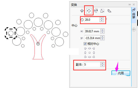 12、還是一樣點擊排列菜單,設置旋轉,設置28的角度, 副本為5,點擊應用