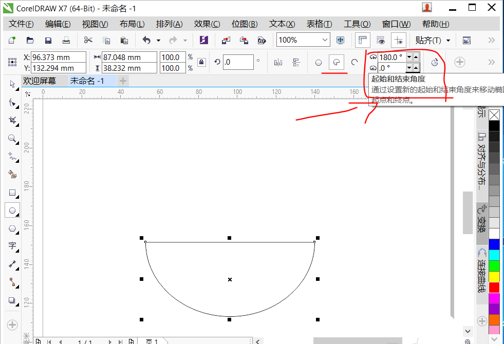 2、選擇屬性欄餅圖工具,設置角度180度到0度