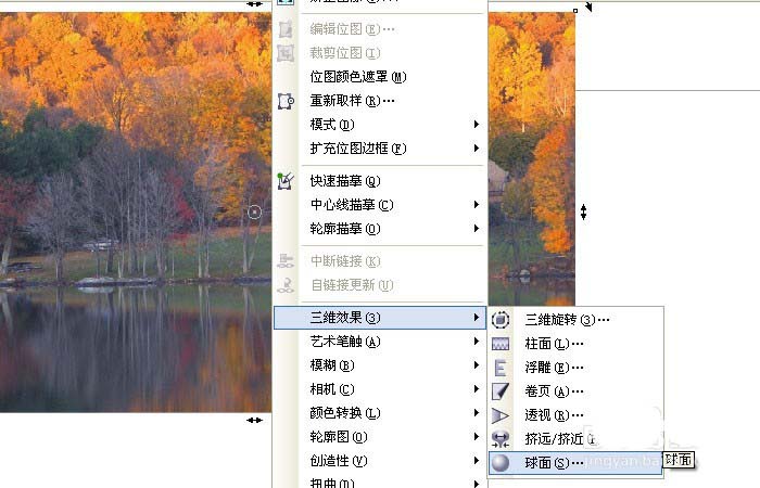 5、接著,鼠標左鍵單擊菜單【位圖】>>【三維效果】>>【球面】,如下圖所示。給素材圖片添加一個球面效果。