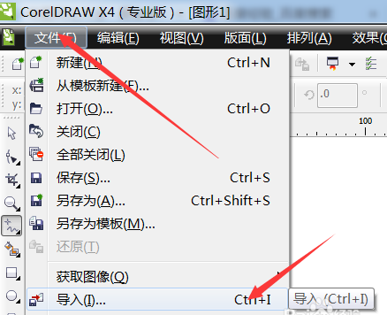 2、在工具欄左邊找到“文件”,鼠標單擊“文件”彈出下拉菜單,然后按下圖所示找到“導入”并單擊,或者快捷鍵“Ctrl+1”.
