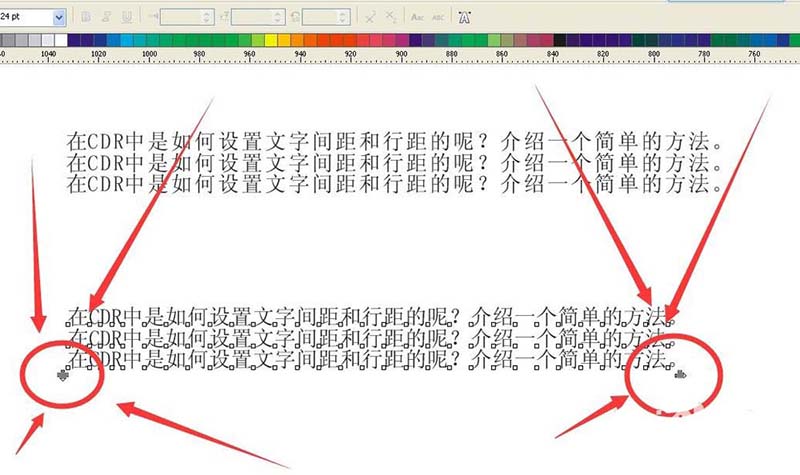 4、這個時候用形狀工具點擊文本文字,點擊后文本文字的左右方就會出現一個控制柄,這兩個控制柄可以隨意進行拖動,左下方的控制柄可以進行上下拖動,拖動后,每一行文字與每一行文字之間的間距就會改變;右方的控制柄可以左右隨意拖動,拖動后,字與字之間的間距會或大或小的改變。如下圖所示。