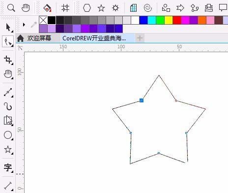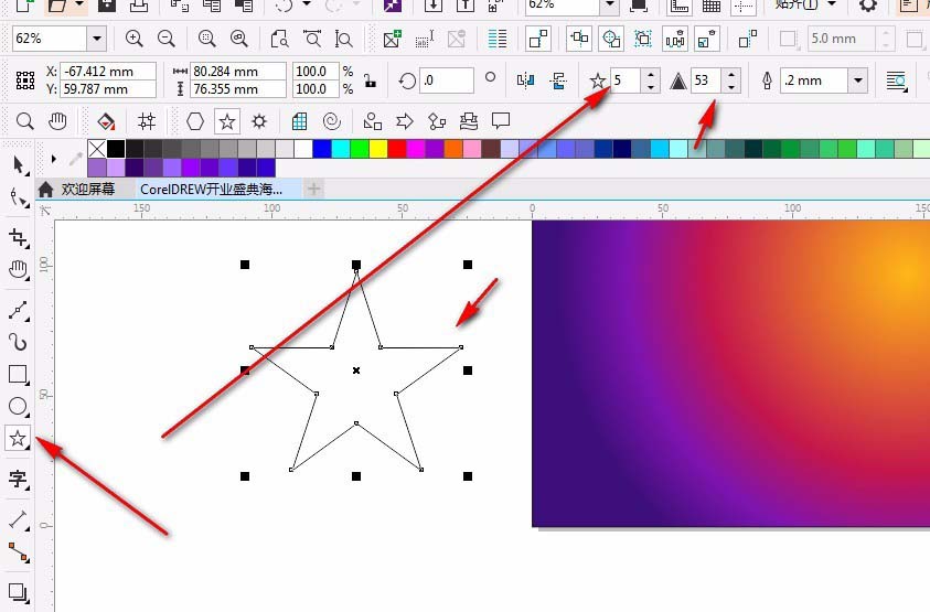 4、選擇星星工具,在頁面中拉出一個星星,屬性欄輸入邊數5,銳度53,效果如圖。 用形狀工具拉出想要的效果,如圖。