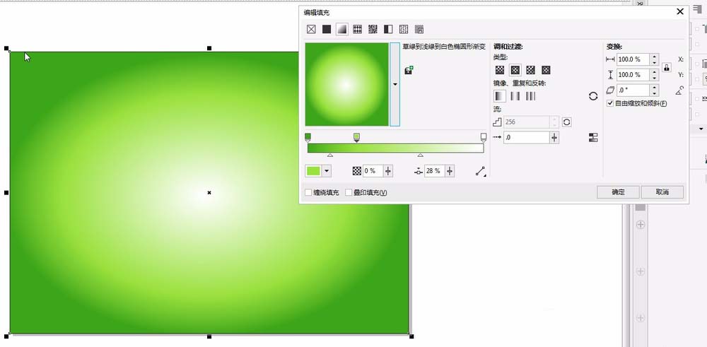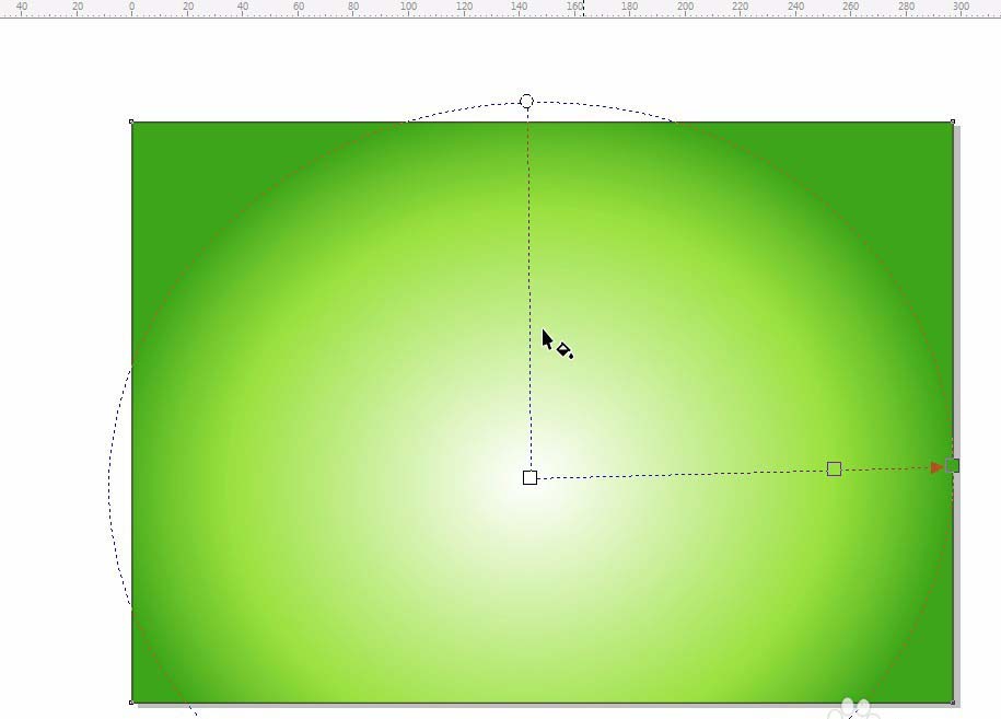 2、雙擊矩形工具,繪制一個和頁面等大的矩形。按F11填充橢圓形漸變,顏色值為①#3DA618②#99E13C③#FFFFFF;按G調整中心點位置。