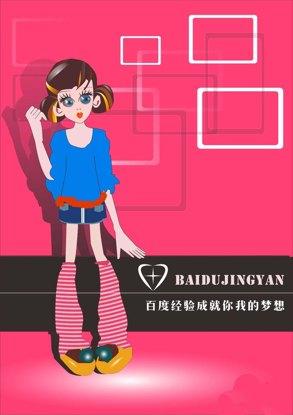 5、用貝塞爾工具繪制下半身。裙子和腿鞋子。裙子畫三篇,底層一片,上面一個花的裝飾。然后按ctrl+pagedown向后層移動。再畫兩個口袋。如圖??蜻x全部。按F12去掉輪廓線。中間畫兩個矩形。如圖。填充白色。去掉輪廓線。往后移一層。并調整腰花的形狀。如圖。轉換到選擇工具。全選群組。按ctrl+g;放在衣服下面。調整好大小。