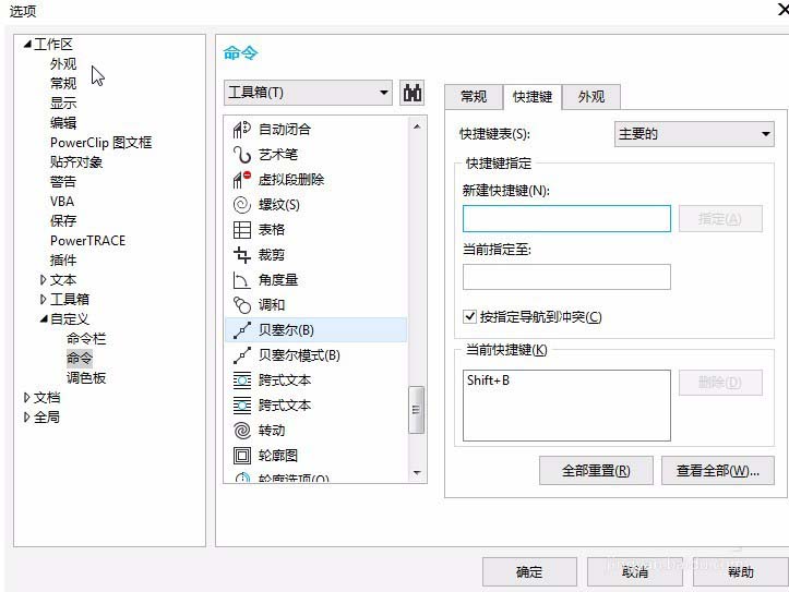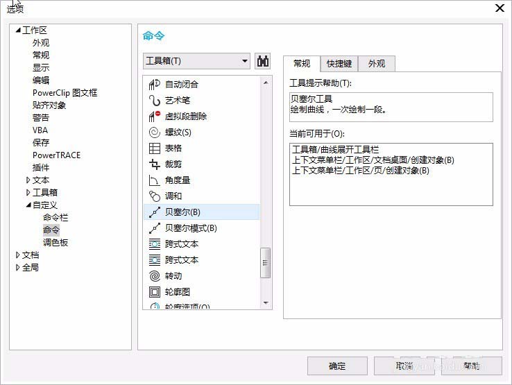3、在打開的選項(xiàng)里,命令下拉菜單選擇工具。找到工具箱-->選擇貝塞爾(B)點(diǎn)擊一下看到右面的面板的提示:為貝塞爾工具。就對(duì)了。