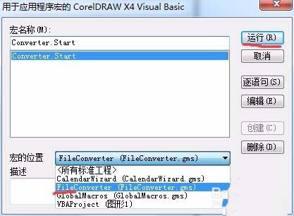 2、在對話框下面的宏的位置中選擇FileConverter,然后點擊運行,然后會彈出一個對話框。