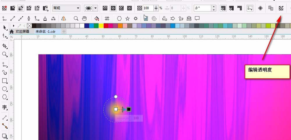 5、繪制正圓填充黃色cmyk:0;0;100;0。添加透明度。點擊透明度工具,在屬性欄選擇,編輯透明度,為橢圓形漸變 模式為:添加。左鍵拖動右鍵點擊復制一個。多復制幾個。放置在不同的位置。
