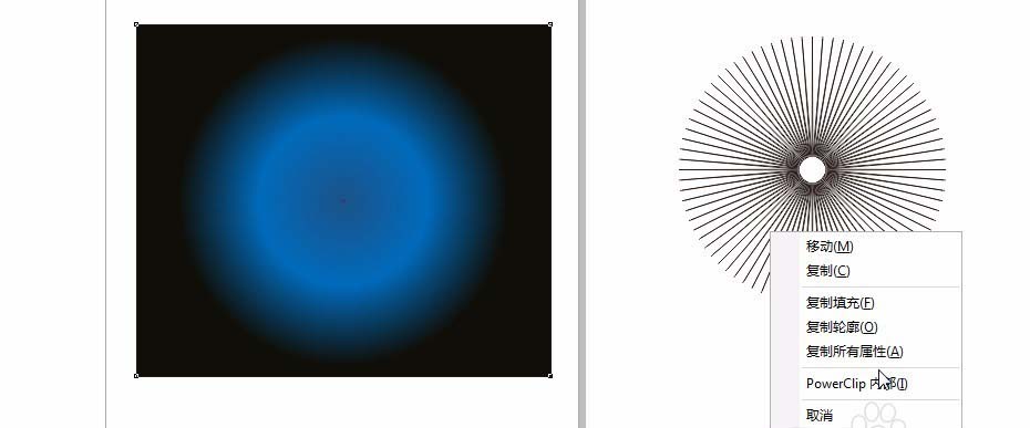 4、鼠標右鍵將漸變矩形拖動到星形上。選擇復制填充。如圖。并右鍵單擊取消輪廓。