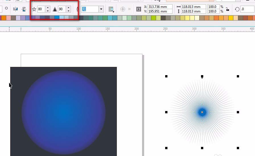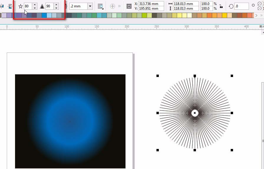 3、選擇工具欄星形工具,按住ctrl繪制一個星星,點擊屬性欄的點數或變數添加80個邊。銳度,改成90回車確定。