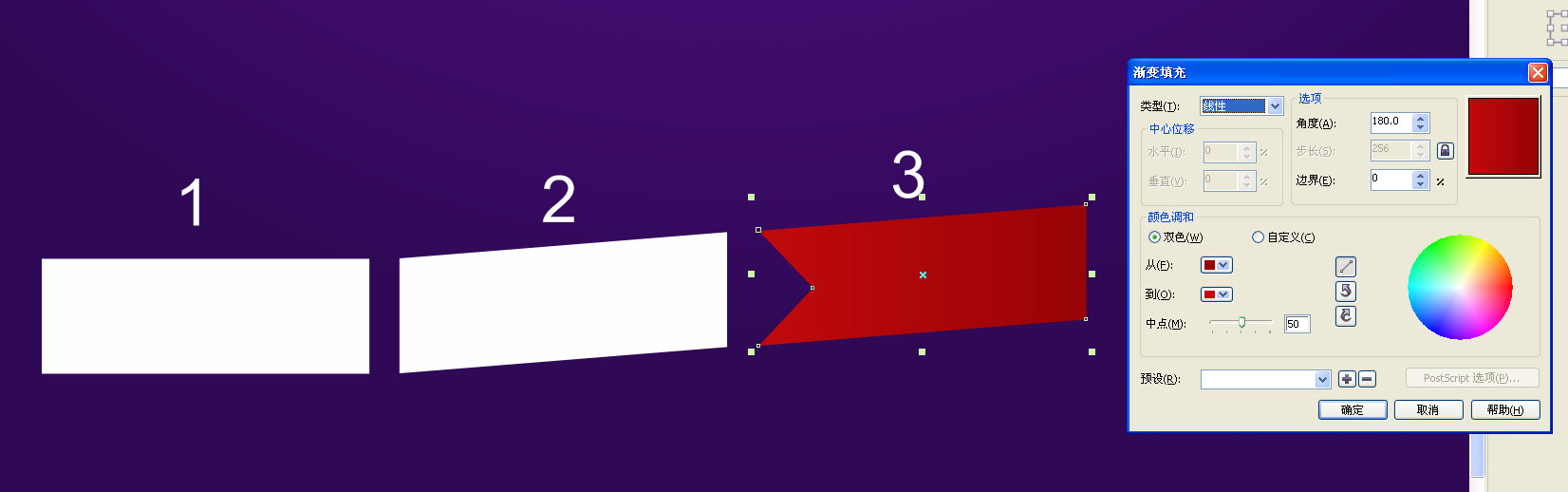 10、把步驟9復(fù)制的矩形拉過來雙擊往上傾斜下,填充顏色,如圖