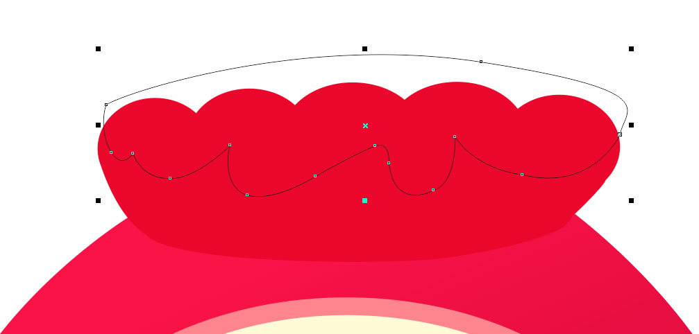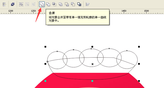 5、用貝賽爾工具繪制袋口放到橢圓上面,然后把橢圓和形狀全部選中點擊合并,如圖