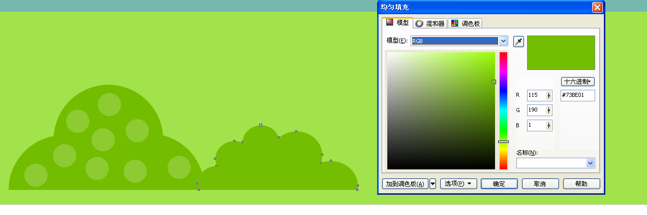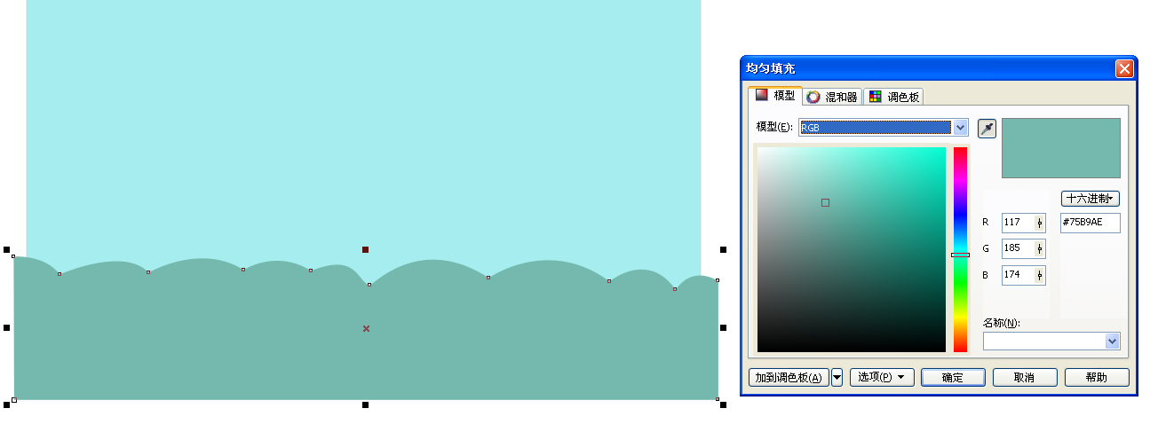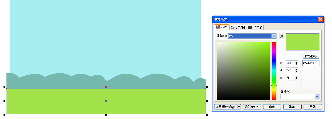 2、選擇左邊工具欄里的貝賽爾工具繪制一個起伏的山坡,隨意畫,填充顏色,如圖