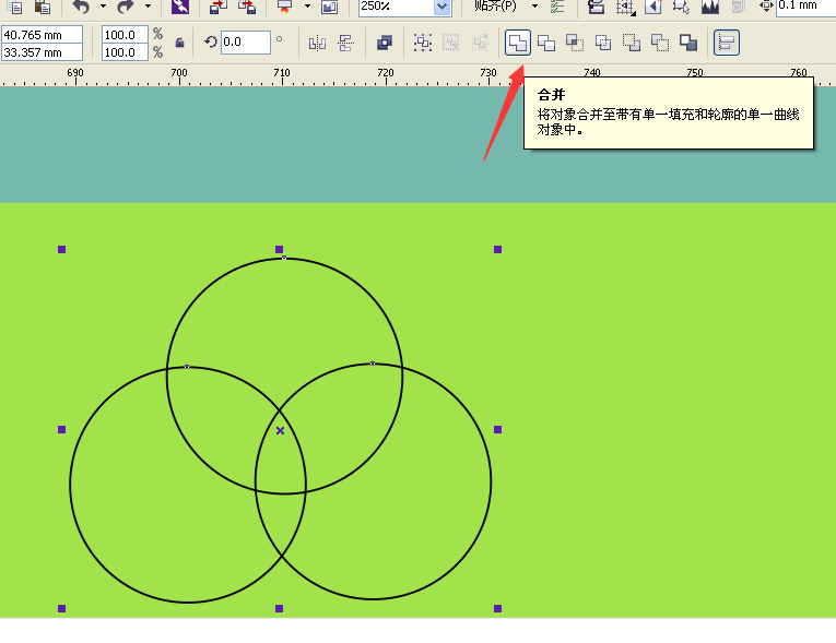 9、把橢圓全部選中點擊合并,再繪制一個矩形放到上面,移除前面對象,去掉輪廓填充顏色,如圖