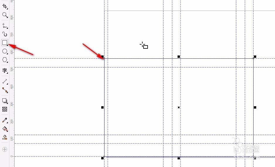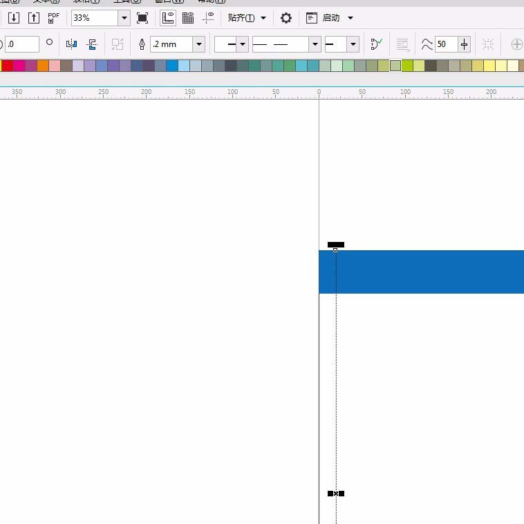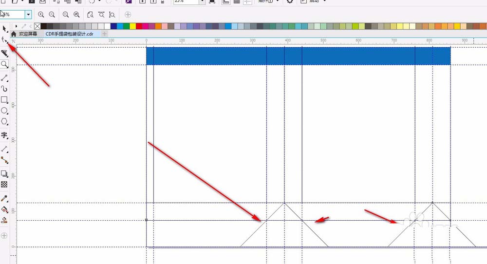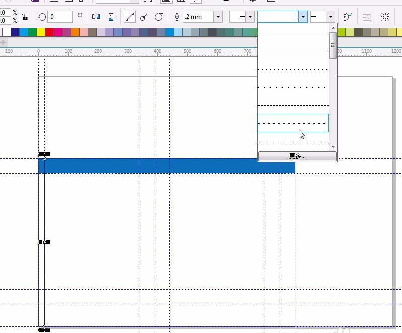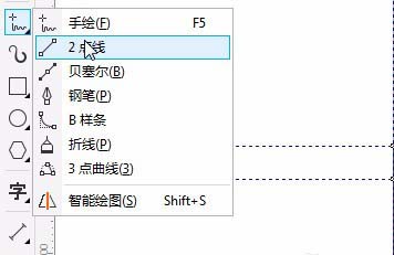 5、折線條的繪制。點擊工具2點線,選擇完畢后,在頁面上按住shift鍵繪制垂直線。在屬性欄設置為需要的虛線形式。如圖所示。