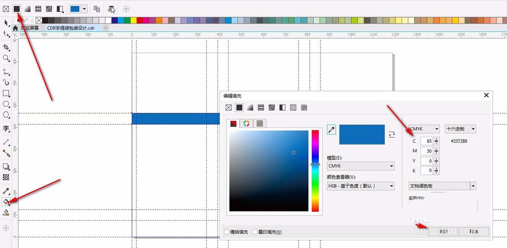 4、點擊矩形工具繪制一個矩形。將整體先繪制出來,對象的寬度和高度分別為:860mm,565mm;另外繪制一個矩形,并給他填充顏色,c:85 m:50 y:0 k:0。如圖所示。并在顏色工具欄點擊鼠標右鍵在XX上。如圖所示。去除輪廓線。