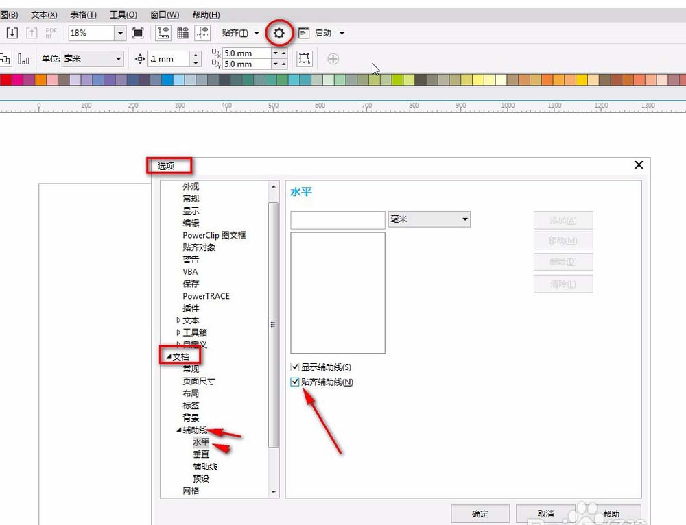 2、設置輔助線,輔助線就是為了給我們準確繪制刀版圖的。鼠標右鍵,在標尺上單擊右鍵輔助線設置。或點擊設置,選項-->文檔-->輔助線-->水平-->勾選貼齊輔助線,和顯示輔助線;