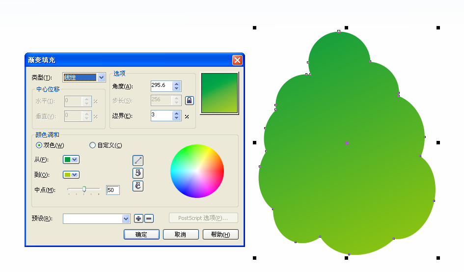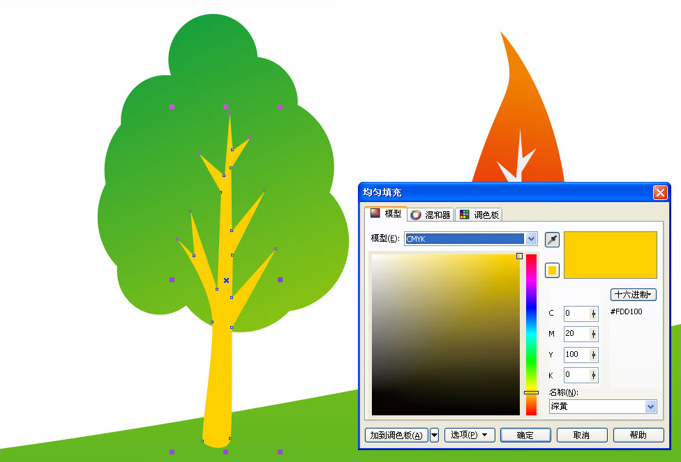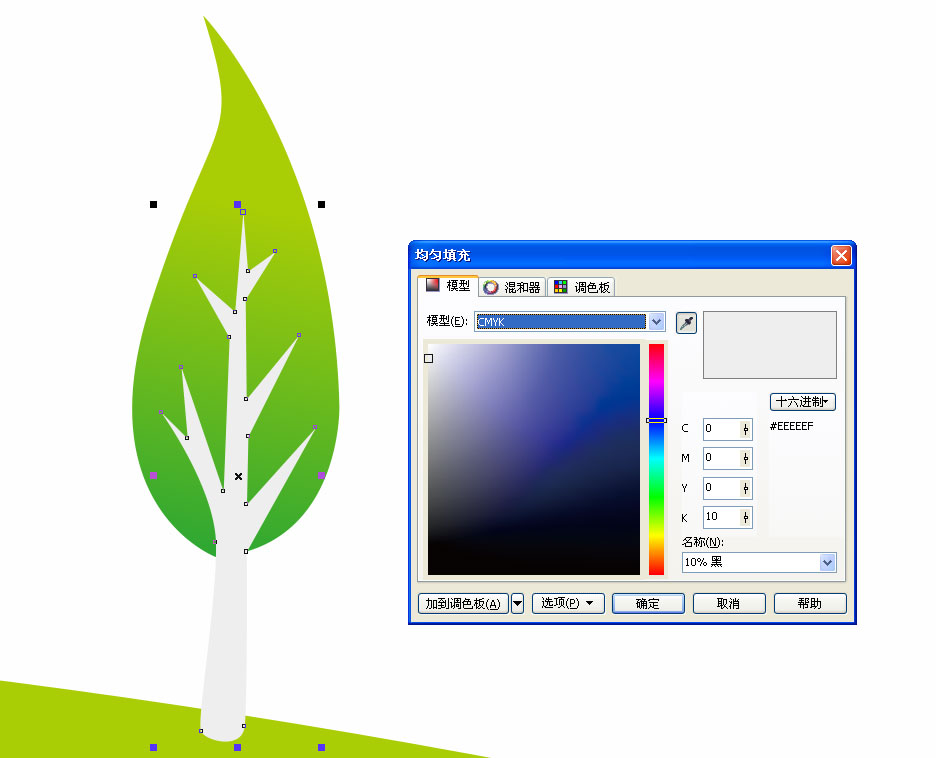 3、繪制樹,橢圓工具繪制一個橢圓,轉曲用形狀把上面和下面兩個節點都設置成尖突,左右兩邊的節點刪除,左邊再雙擊添加一個節點,用形狀工具去調成下圖形狀,填充顏色,如圖