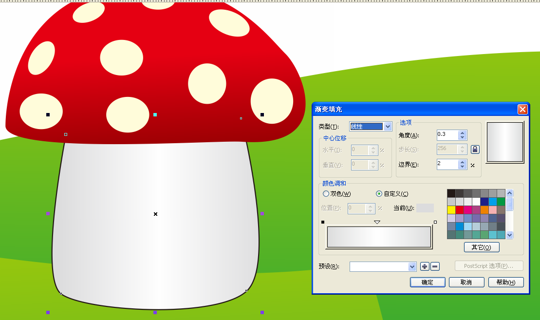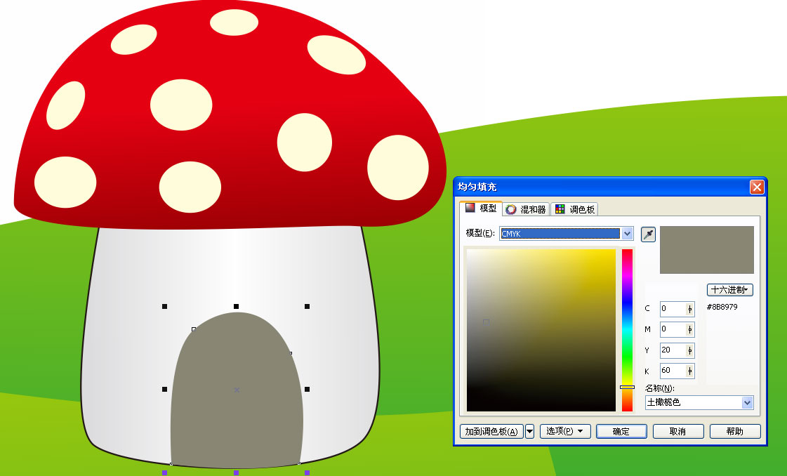 8、繪制可愛的蘑菇房子,用貝賽爾工具繪制下面圖形,填充漸變,再用橢圓工具繪制橢圓多復制幾份放到蘑菇上面,如圖