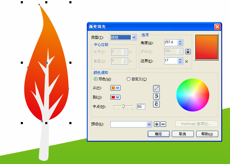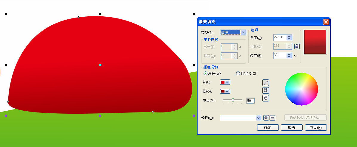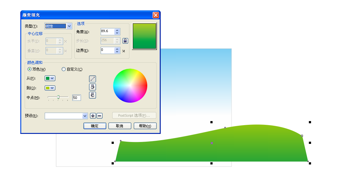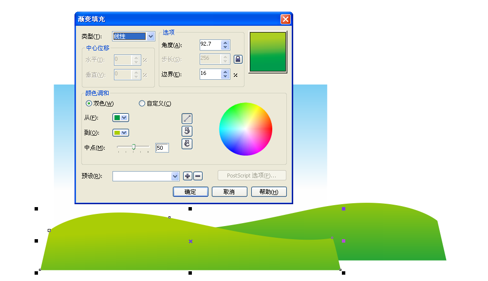 2、用貝賽爾工具繪制草地,填充顏色,把繪制好的草地復制一層,重新填充顏色把它水平鏡像,如圖