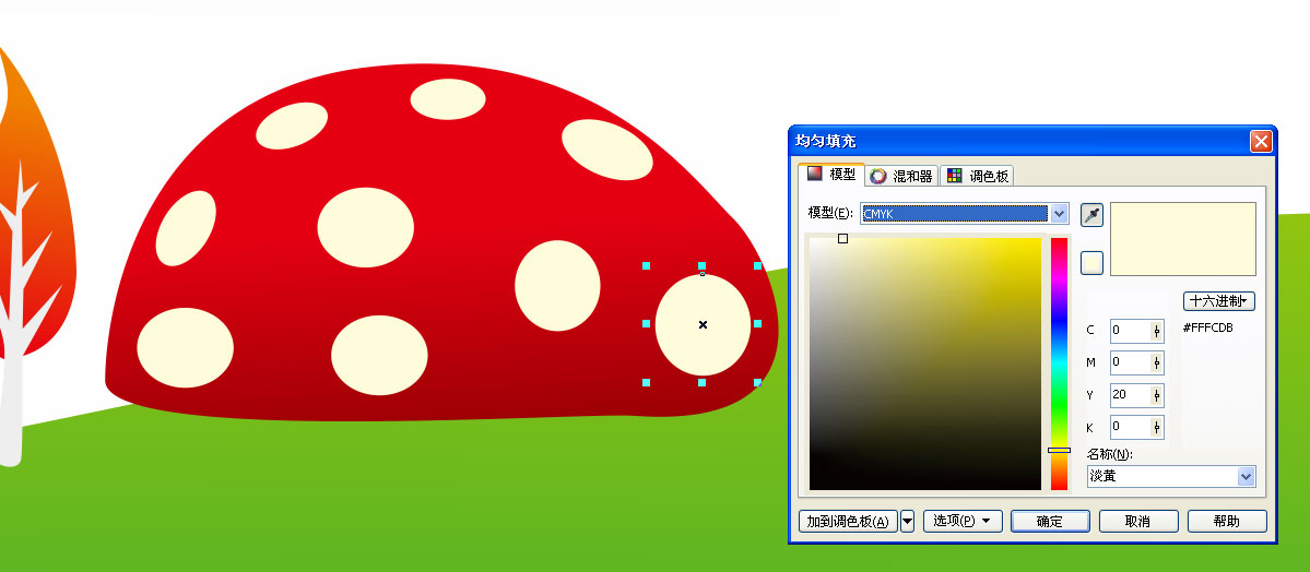 9、選擇矩形工具繪制一個矩形轉曲,用形狀工具把下面尖角調成圓滑,填充顏色,加粗輪廓,置于蘑菇的下層如圖