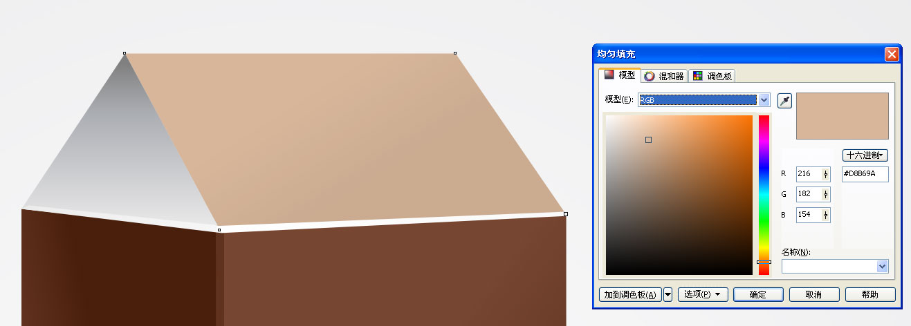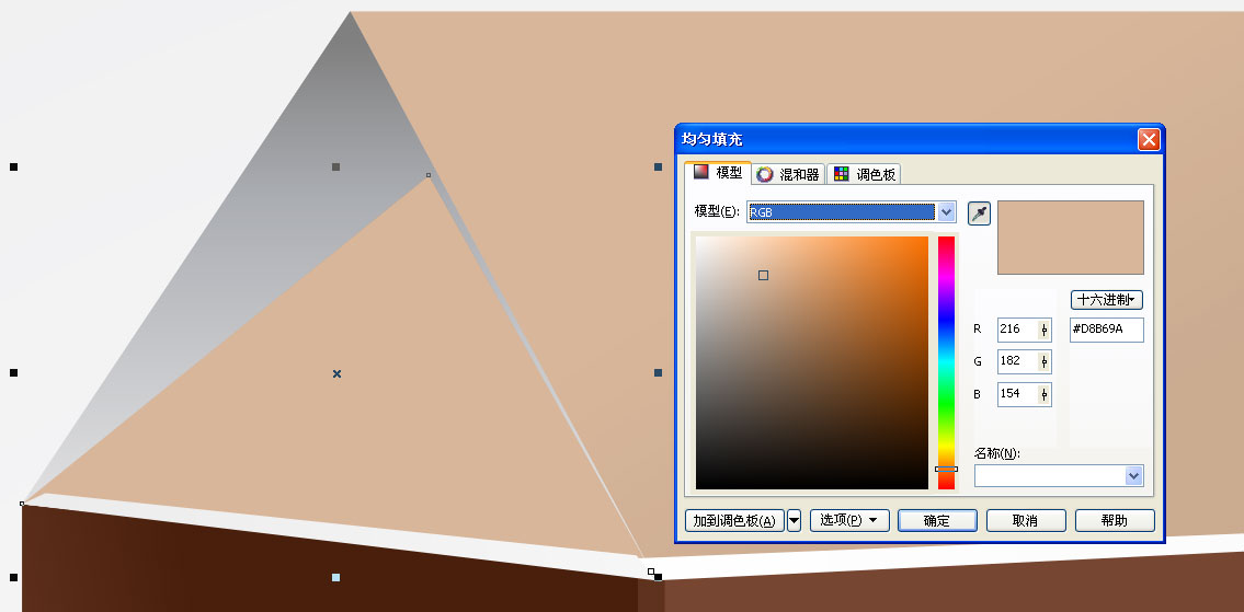 5、用貝賽爾工具繪制一個三角形放到側(cè)面,填充顏色,如圖