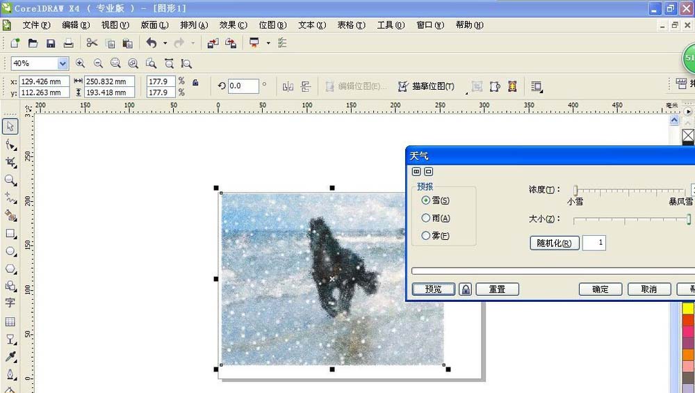 3、選擇位圖,天氣,勾選雪的效果,設(shè)置為小雪花的效果,點擊預(yù)覽,可以自動查看圖片的效果。