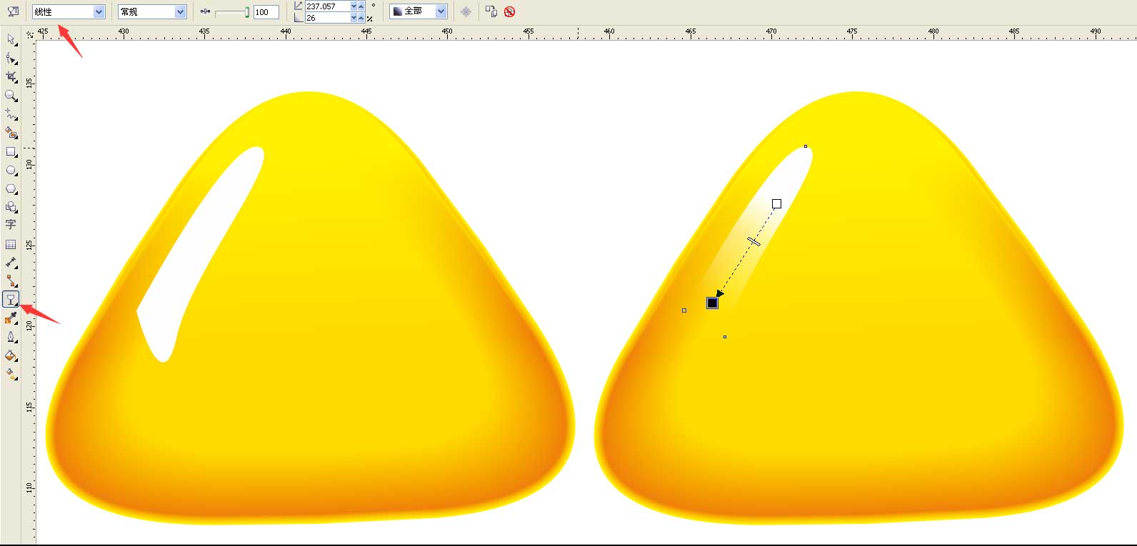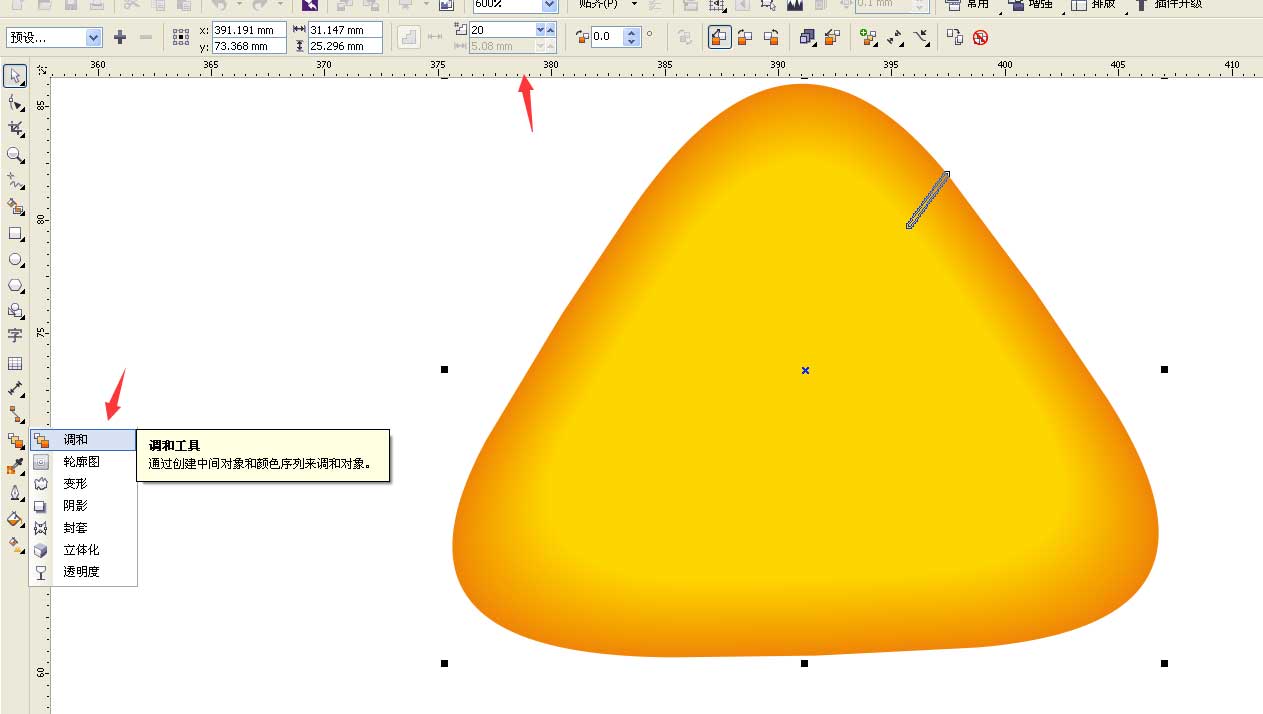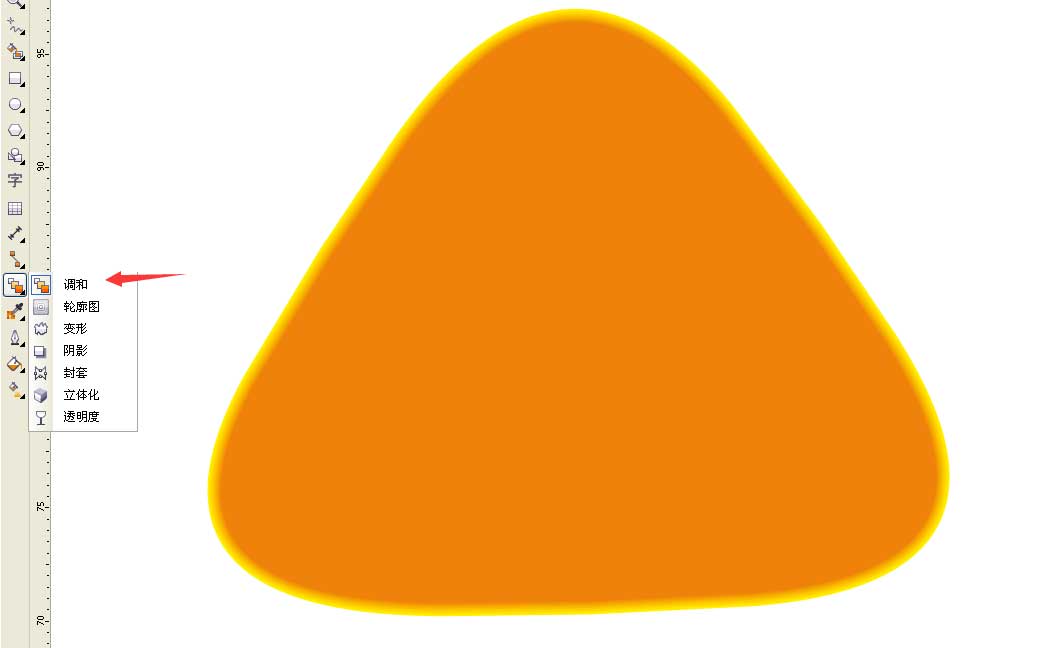 6、選擇左邊的調和工具從橙色三角形拉以黃色三角形,步長設置為20如圖