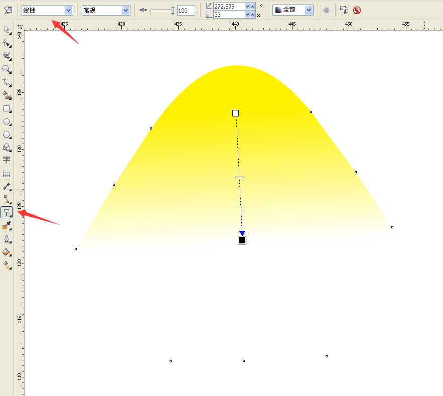 2、把三角形填充顏色黃色取消輪廓,轉曲用形狀工具把三角形調成下圖形狀,如圖