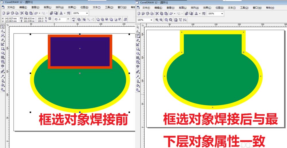 1)如果我們是框選對象后焊接,焊接后的圖形屬性與我們框選對象的最底層的對象屬性一致。
