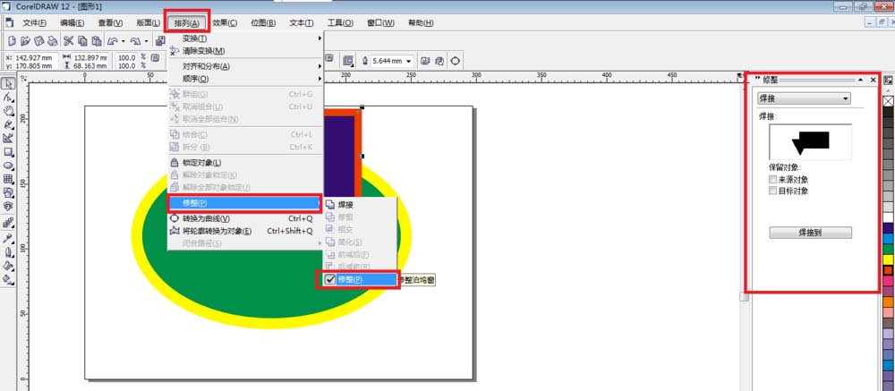 2、我們還可以通過單擊菜單欄,"排列/修整/修整工具"進入修整泊塢窗進行焊接。