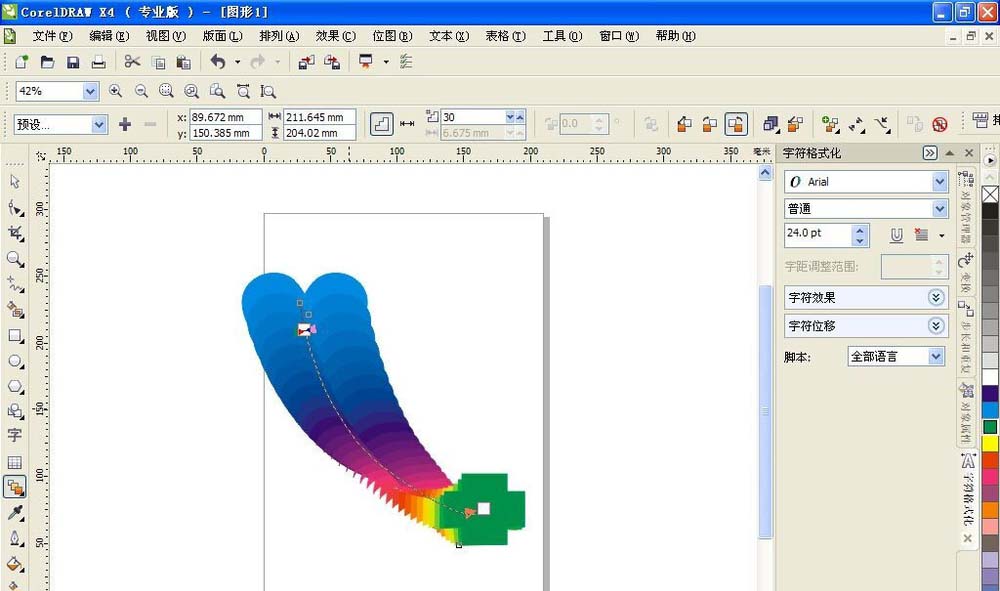 2、選擇交互式的調和效果工具,對兩個形狀的控制點進行拖動,拖動到合適的位置,如圖,選擇手繪工具,繪制一條線段,然后選擇新建路徑,點擊一下形狀圖形,圖形會自動跟隨著手繪線條進行填充。然后選擇旋轉路徑,會按照彩虹色進行漸變。如圖
