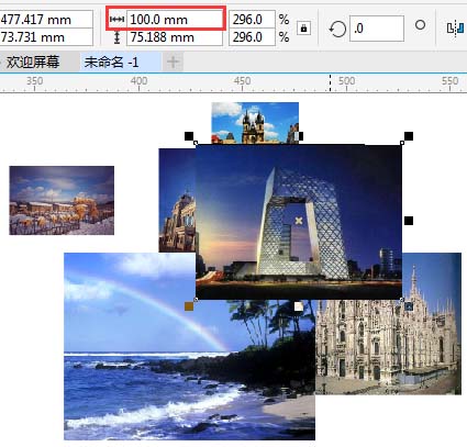 2、然后選擇其中一張圖片,在屬性欄設置好該圖片的尺寸按回車,比如設置圖片寬為100mm(在鎖定比率的狀態下,高自動根據寬的變化而變化)。