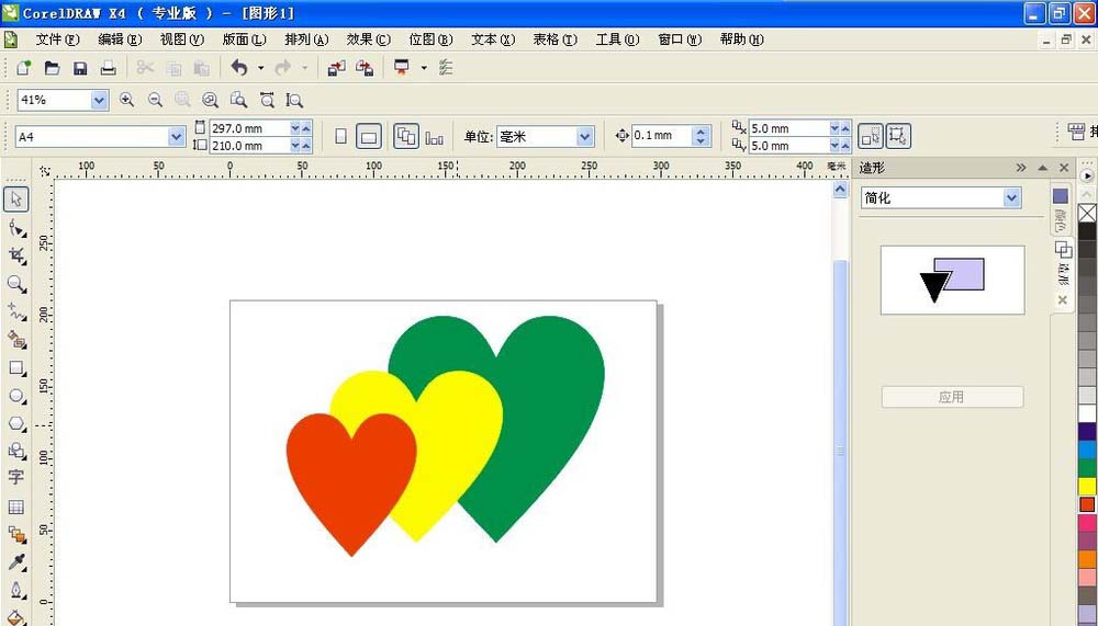1、按crl+N新街口一個空白文檔,選擇形狀工具,找到桃心的工具。繪制三個桃心,然后每個桃心都填充顏色,包括紅色,黃色,綠色。綠色的桃心位于最底層。如圖