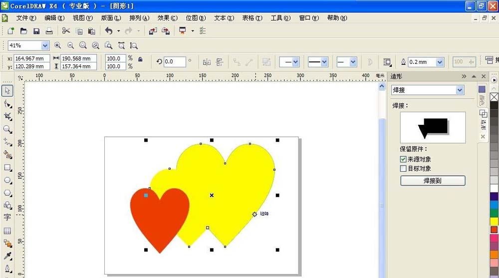 2、選擇焊接工具,可以先選擇綠色的桃心,然后選擇排列,造型,焊接,然后點擊一種圖形,那么另外一種圖形也會跟隨著變色。如圖