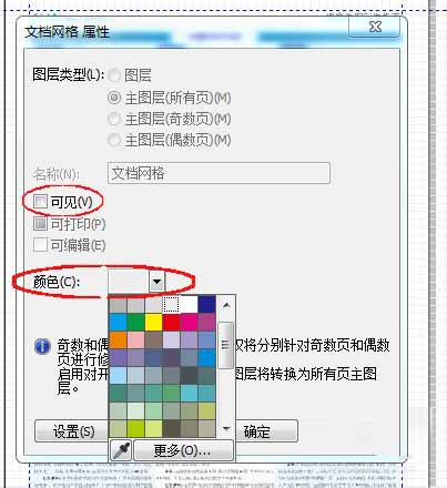7、彈出了文檔網格的屬性后。就按如下圖設置設置一下即可,把可見前面的按鈕勾選掉。然后顏色改為白色!最后是“確定”。