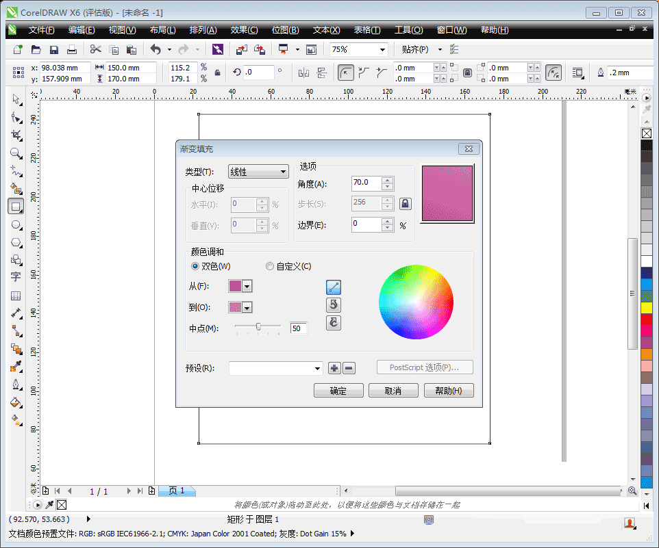 2、打開工具箱的“漸變填充”工具,將背景顏色設置為線性漸變的,角度為70的無輪廓圖樣。