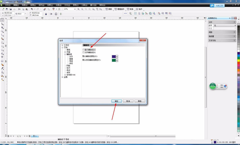 6、將窗口中的顯示輔助線取消選定,完成后單擊確定,