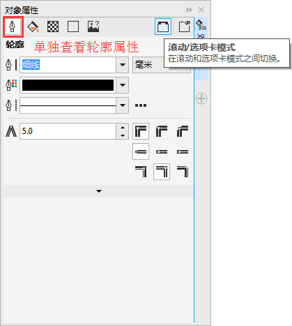 您可以使用對象屬性泊塢窗頂部的控件來快速瀏覽至要修改的屬性。此外,還有兩種查看模式可用:滾動和選項卡模式顯示所有相關對象屬性,使您可以滾動到您需要的選項。選項卡模式一次僅顯示一組對象屬性,同時隱藏其他選項。例如,您可以只查看填充選項,然后單擊輪廓按鈕只查看輪廓選項。