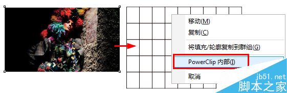 步驟2:找到工具箱中的圖紙工具,并且先設(shè)置好圖紙的行數(shù)、列數(shù)。必須是先設(shè)置后繪制才可以。然后將圖片按住鼠標(biāo)右鍵拖拽到圖紙中,在彈出的快捷菜單中選擇“PowerClip內(nèi)部”命令。