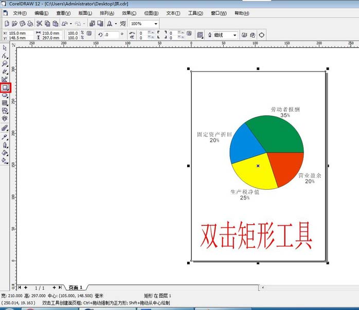 1、在導出圖像之前,先確保你繪制的圖形在頁面中,然后雙擊矩形工具,得到一個與頁面大小一樣的矩形