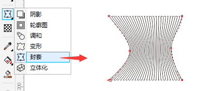 步驟3:使用封套工具創建封套效果,單擊“封套工具”,在調和對象上會出現封套邊界框,任意拖動節點改變對象形狀。