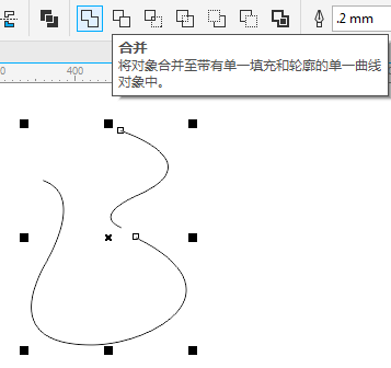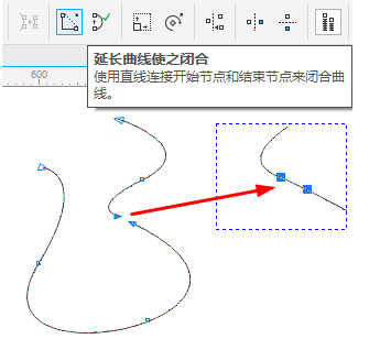 2. 使用“形狀工具”選擇要連接的節(jié)點(diǎn),按住Shift鍵,可以加選其他子路徑的節(jié)點(diǎn)。然后單擊屬性欄上的“延長曲線使之閉合”按鈕
