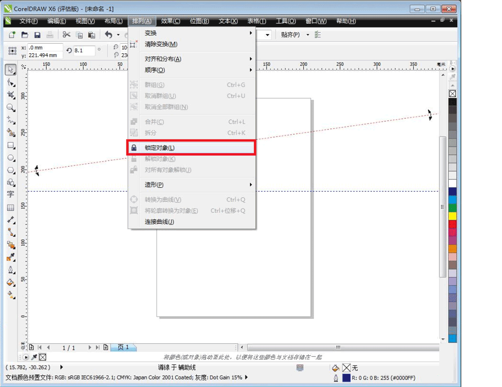 6、調整完畢后,如需要鎖定該條線,即點擊菜單欄上“排列”按鈕,在下拉菜單中選擇鎖定對象即可,那么該輔助線不能被移動或更改。