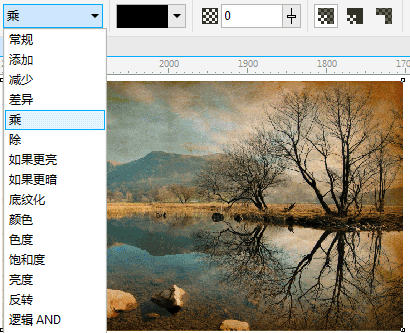 方法二、依然使用透明度工具,設(shè)置其屬性欄中的“合并模式”,單擊右側(cè)黑色三角號,選擇“乘”模式。CDR中的合并模式類似于PS中的圖層混合模式,如:“標(biāo)準(zhǔn)模式、疊加模式、柔光模式”等等。