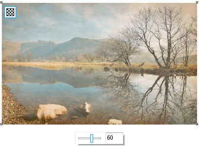 方法一、將“舊紙張”圖片放置在風(fēng)景圖片的上層,使用透明度工具,應(yīng)用顯示對象下層的圖像,并調(diào)整透明度數(shù)值。