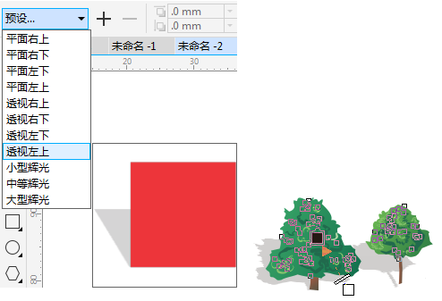4. 如果想要從對(duì)象底部創(chuàng)建陰影,可以借助屬性欄中“預(yù)設(shè)”選項(xiàng),在彈出的下拉列表中選擇一種預(yù)設(shè)陰影,可快速添加常見陰影效果。