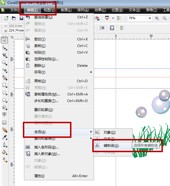 2、如果你要選擇全部所有的輔助線,則需要選擇【編輯】-【全選】-【輔助線】命令即可,如圖下所示