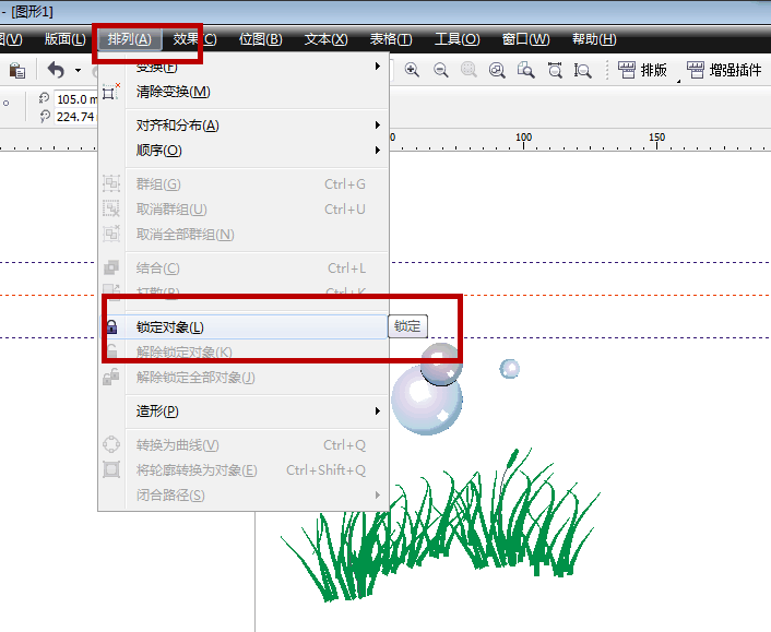 3、當我們選取輔助線后,選擇【排列】-【鎖定對象】命令,這些輔助線就全部被鎖定了,再也不能隨便移動刪除了。