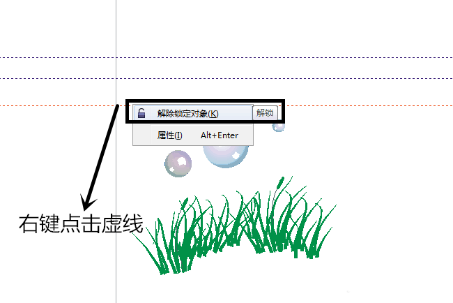 4、這個時候呢想要操作只能解除鎖定了,我們將數遍放到鎖定的輔助線上,右鍵單擊,就會出現一個對話框,選擇對話框中的【解除鎖定對象】命令即可。