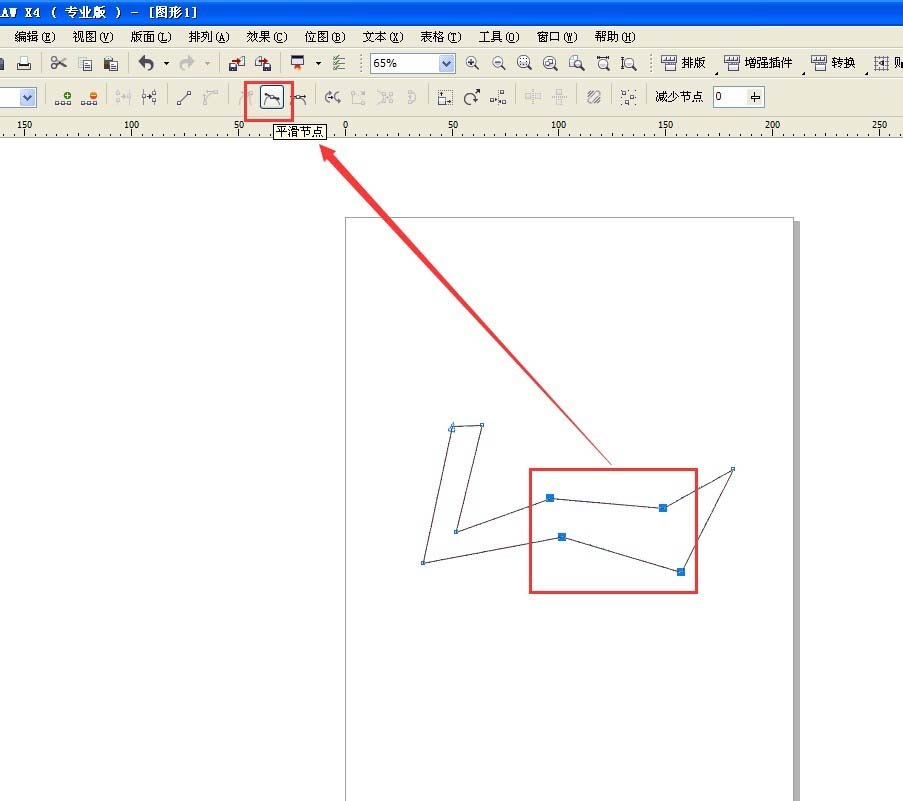 4、框選中間四個節點,點擊屬性欄的“平滑節點”,就變成了平滑節點。